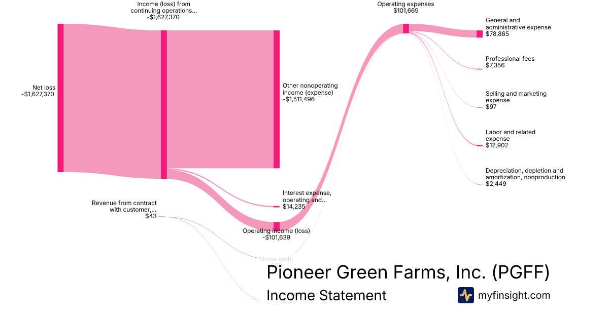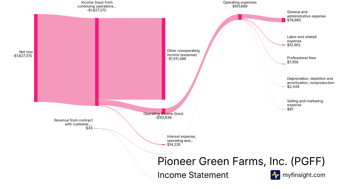 For the quarter ending 2024-09-30, PGFF made $43 in revenue. -$1,627,370 in net income. Net profit margin of -3784581.40%.