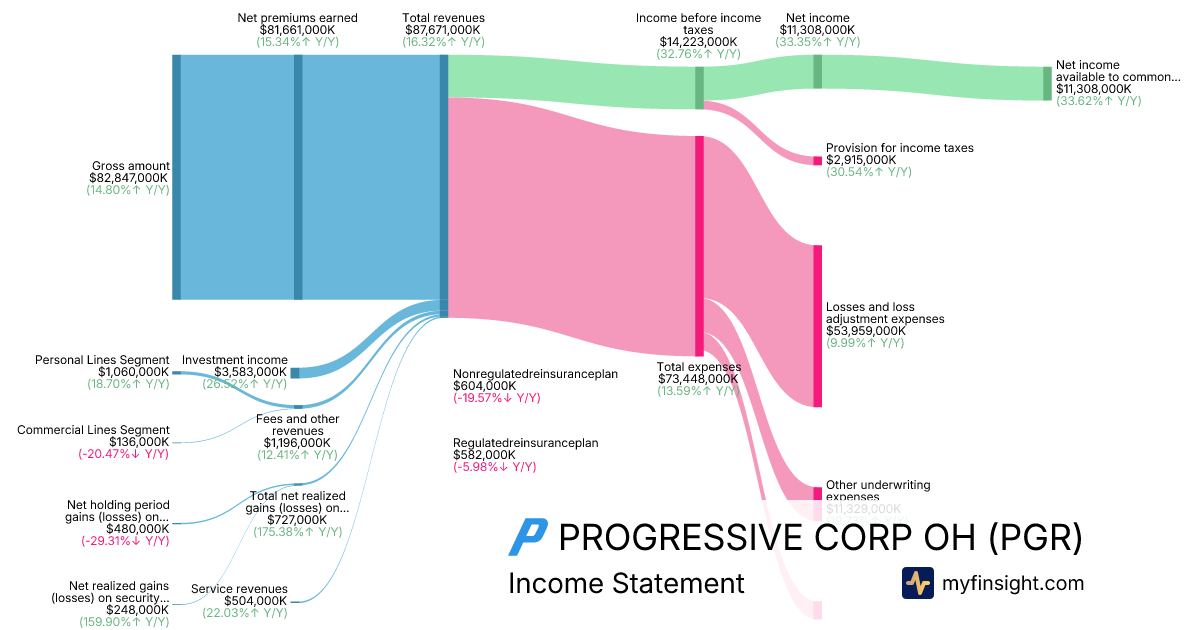 For the year ending 2025-12-31, PGR made $87,671,000K in revenue. $11,308,000K in net income. Net profit margin of 12.90%.