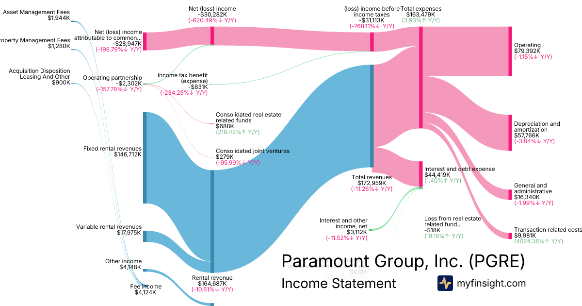 For the quarter ending 2025-09-30, PGRE made $172,959K in revenue. -$28,947K in net income. Net profit margin of -16.74%.