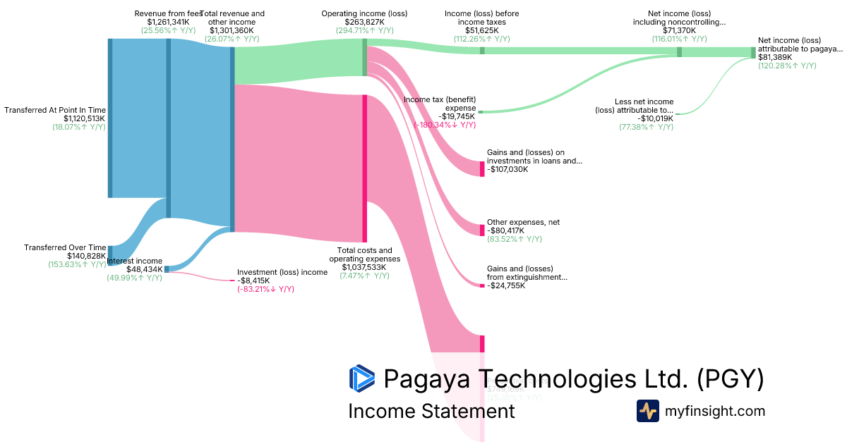 For the year ending 2025-12-31, PGY made $1,301,360K in revenue. $81,389K in net income. Net profit margin of 6.25%.