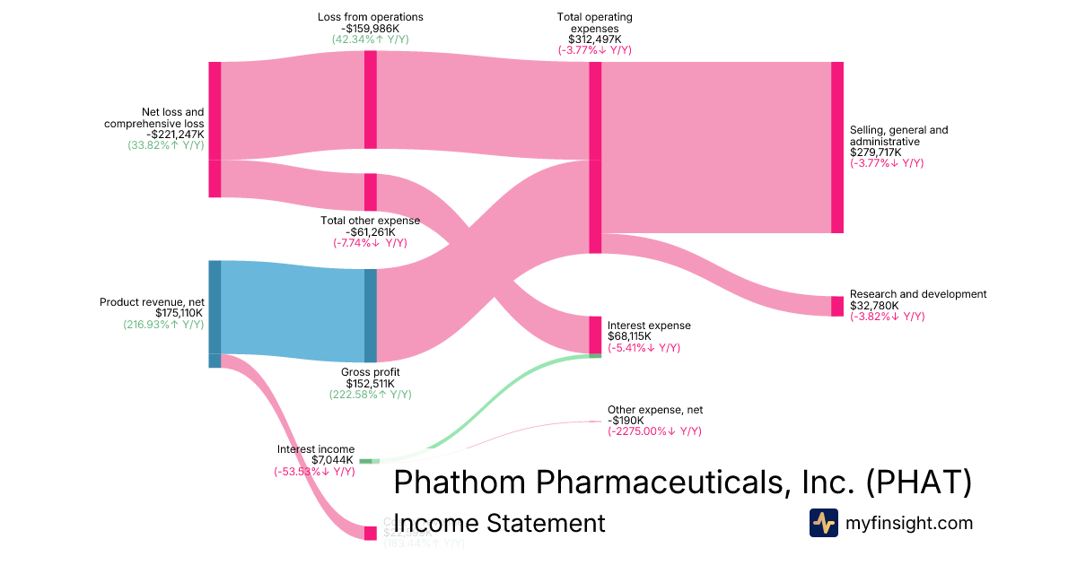 For the year ending 2025-12-31, PHAT made $175,110K in revenue. -$221,247K in net income. Net profit margin of -126.35%.