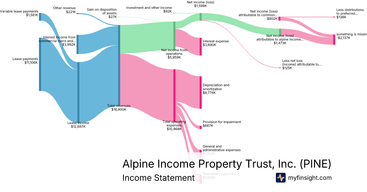 For the year ending 2025-12-31, PINE made $60,532K in revenue. -$3,209K in net income. Net profit margin of -5.30%.