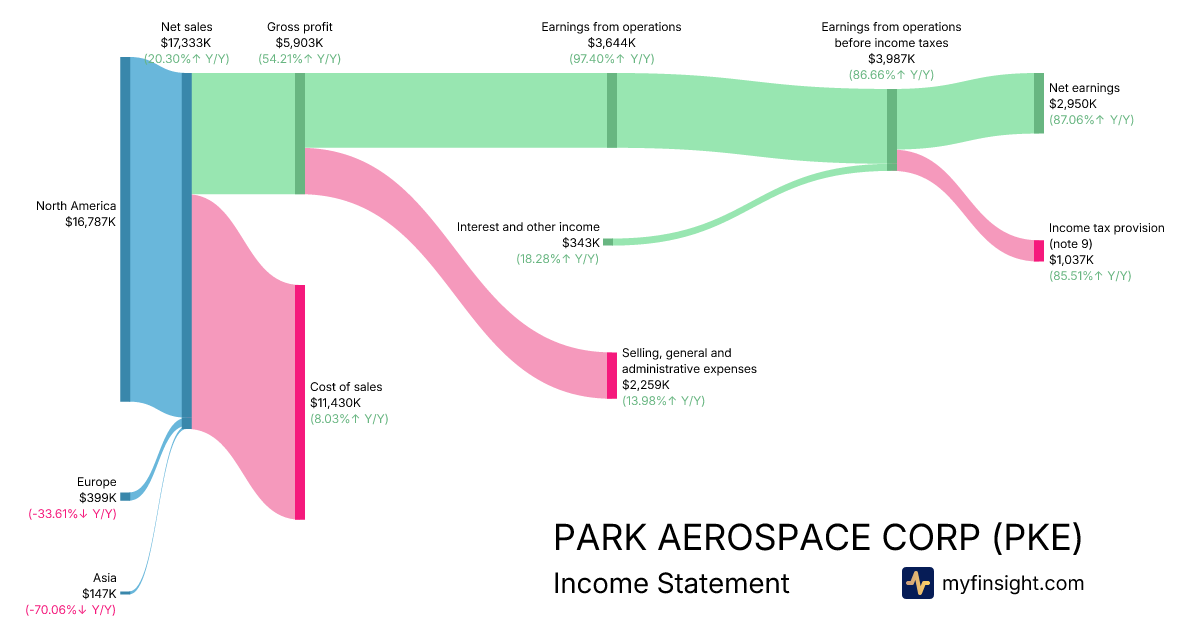 For the quarter ending 2025-11-30, PKE made $17,333K in revenue. $2,950K in net income. Net profit margin of 17.02%.