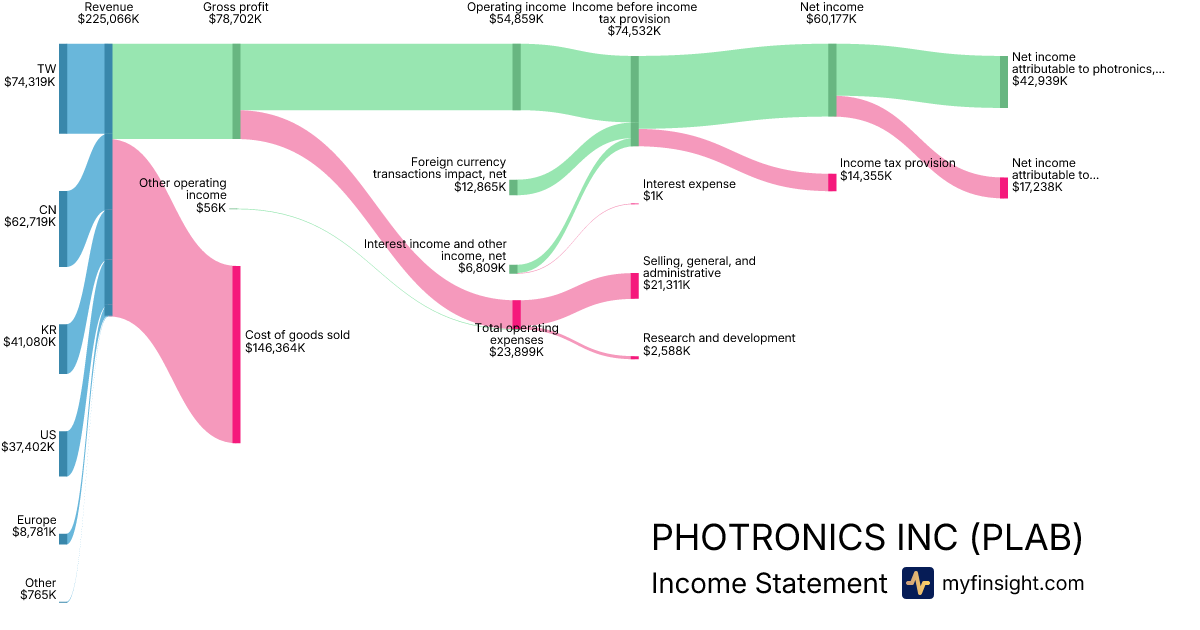 For the quarter ending 2026-02-01, PLAB made $225,066K in revenue. $42,939K in net income. Net profit margin of 19.08%.