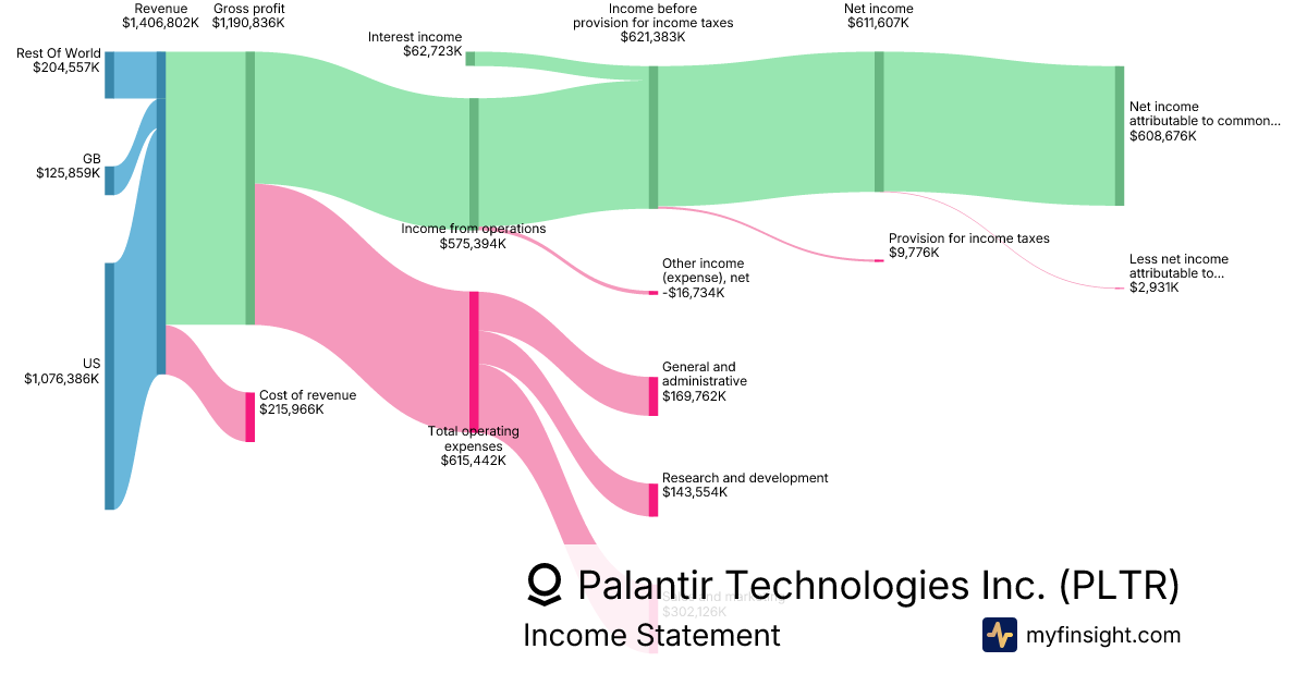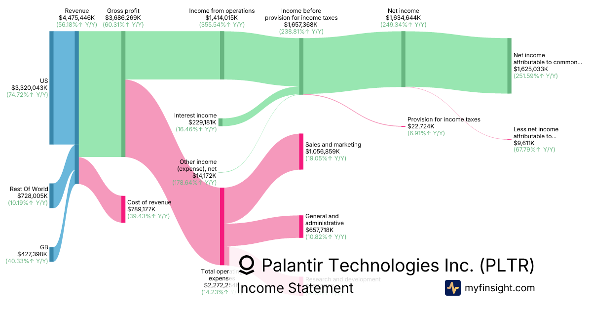 For the year ending 2025-12-31, PLTR made $4,475,446K in revenue. $1,625,033K in net income. Net profit margin of 36.31%.