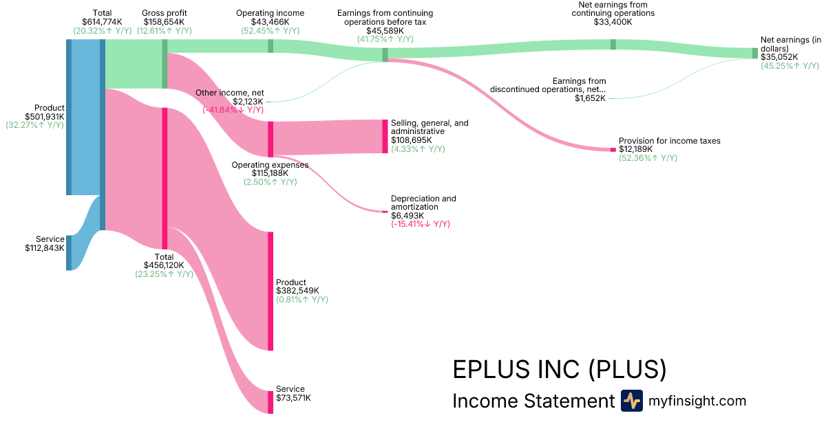 For the quarter ending 2025-12-31, PLUS made $614,774K in revenue. $35,052K in net income. Net profit margin of 5.70%.