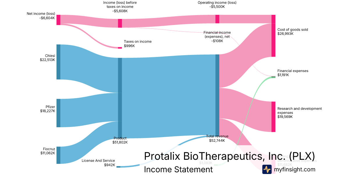 For the year ending 2025-12-31, PLX made $52,744K in revenue. -$6,604K in net income. Net profit margin of -12.52%.