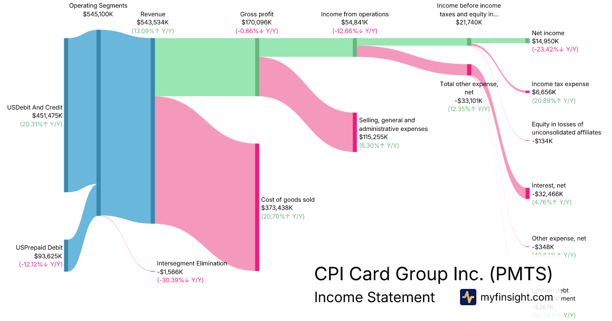 For the year ending 2025-12-31, PMTS made $543,534K in revenue. $14,950K in net income. Net profit margin of 2.75%.