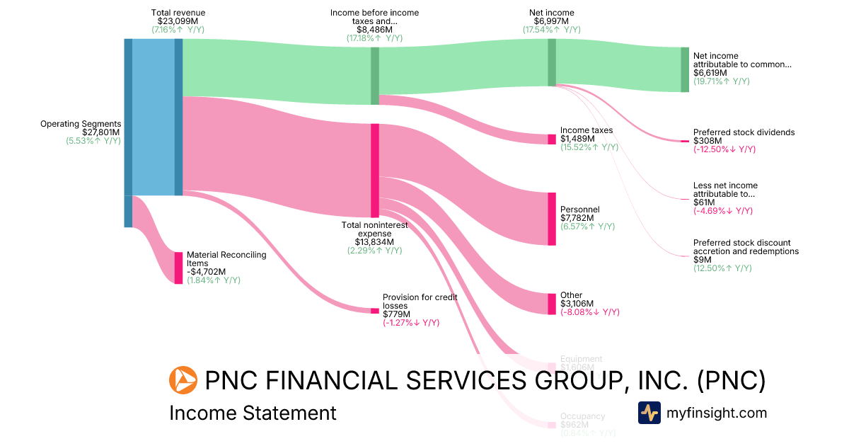 For the year ending 2025-12-31, PNC made $23,099M in revenue. $6,619M in net income. Net profit margin of 28.65%.