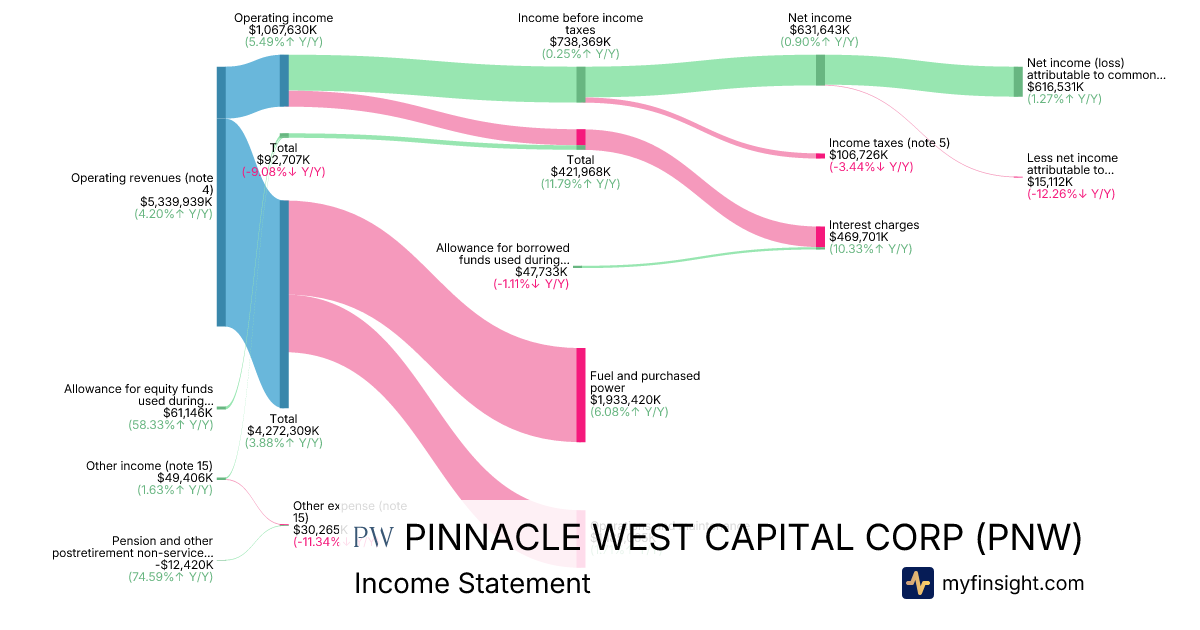 For the year ending 2025-12-31, PNW made $5,339,939K in revenue. $616,531K in net income. Net profit margin of 11.55%.