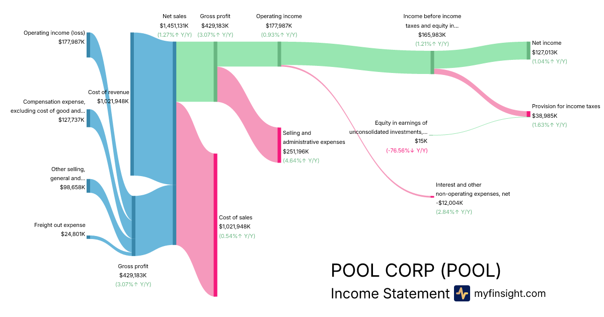 For the quarter ending 2025-09-30, POOL made $1,451,131K in revenue. $127,013K in net income. Net profit margin of 8.75%.