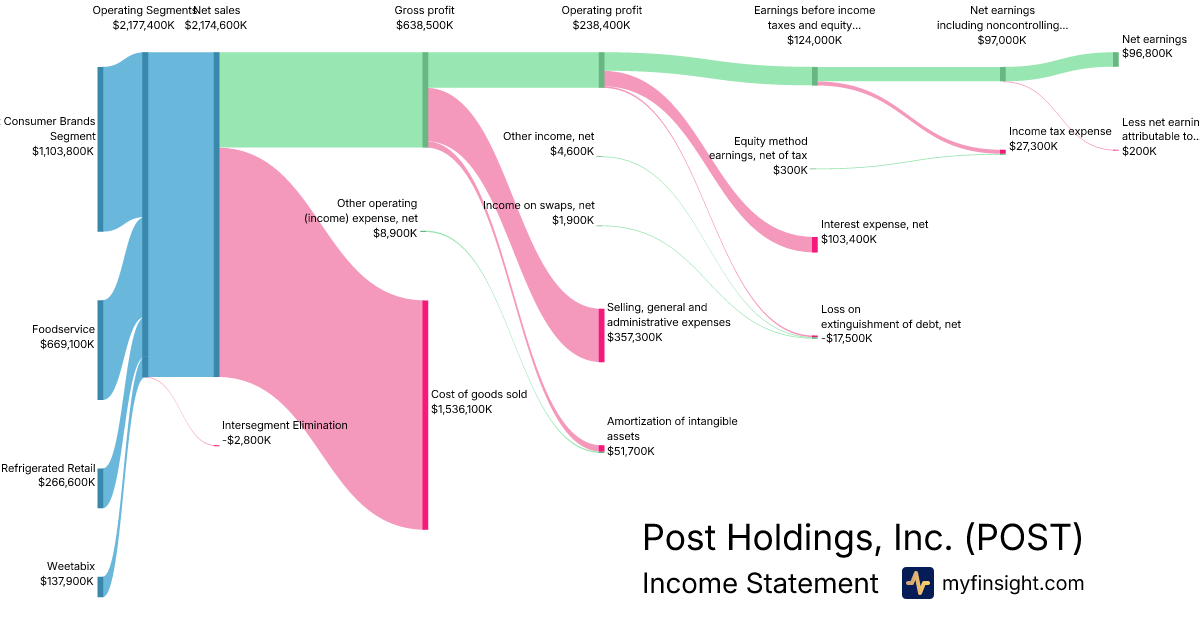 For the quarter ending 2025-12-31, POST made $2,174,600K in revenue. $96,800K in net income. Net profit margin of 4.45%.