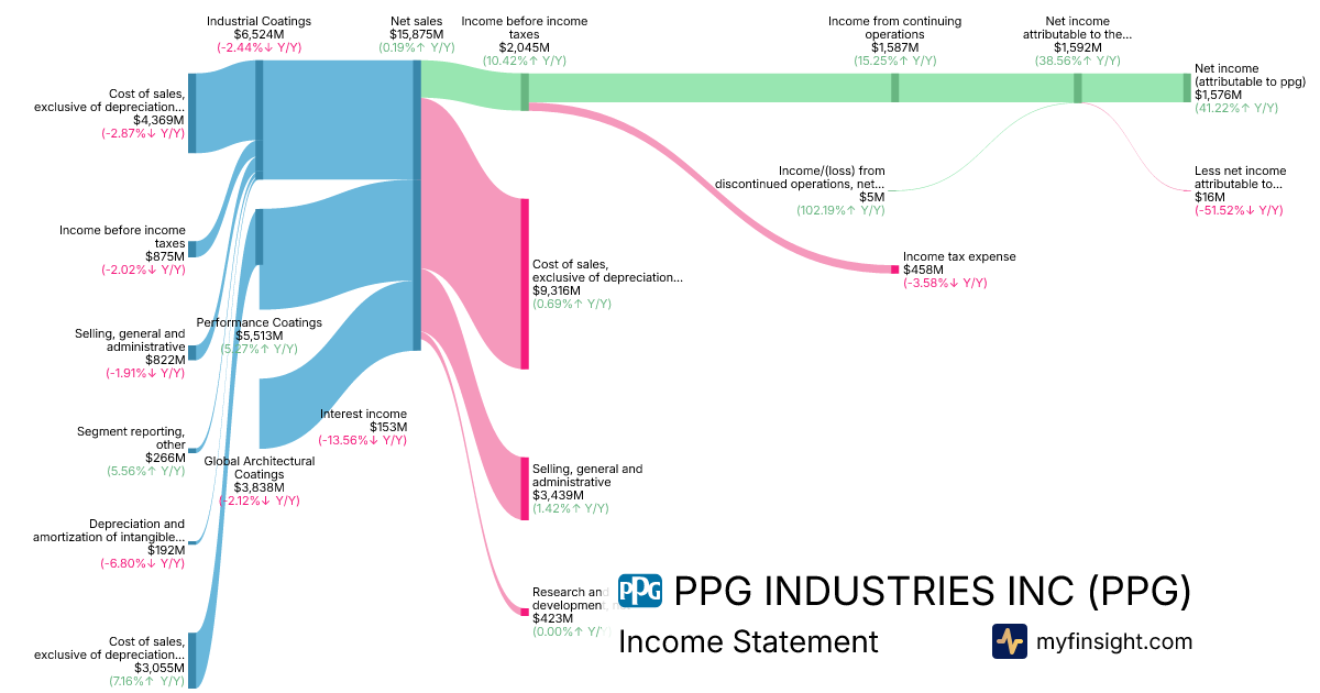 For the year ending 2025-12-31, PPG made $15,875M in revenue. $1,576M in net income. Net profit margin of 9.93%.