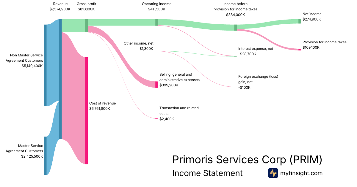For the year ending 2025-12-31, PRIM made $7,574,900K in revenue. $274,900K in net income. Net profit margin of 3.63%.