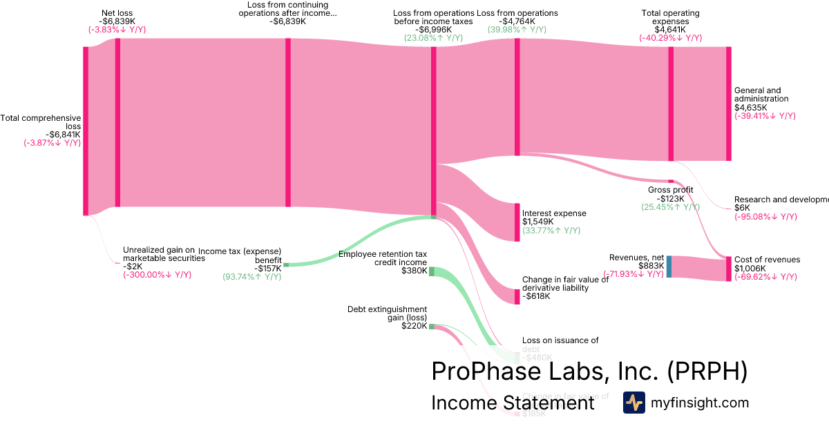 For the quarter ending 2025-09-30, PRPH made $883K in revenue. -$6,841K in net income. Net profit margin of -774.75%.