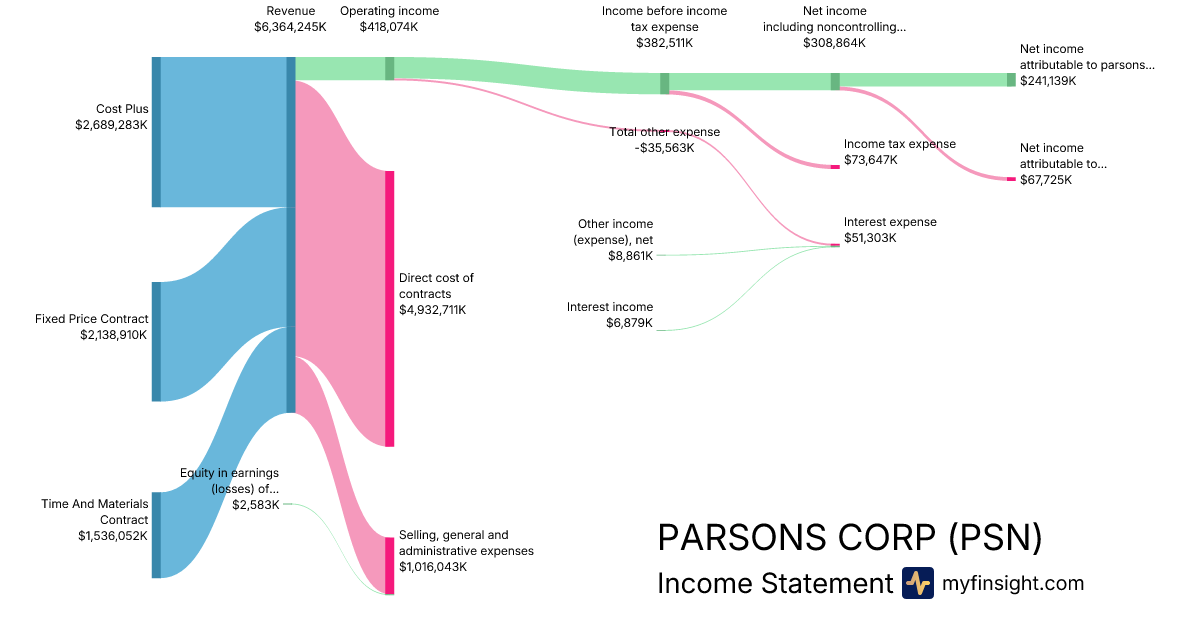 For the year ending 2025-12-31, PSN made $6,364,245K in revenue. $241,139K in net income. Net profit margin of 3.79%.