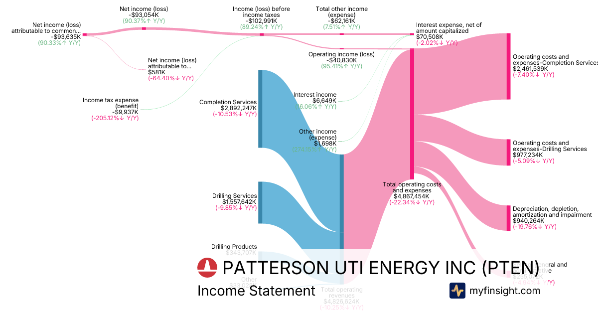 For the year ending 2025-12-31, PTEN made $4,826,624K in revenue. -$93,635K in net income. Net profit margin of -1.94%.