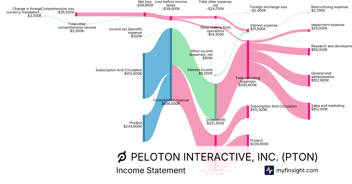 For the quarter ending 2025-12-31, PTON made $656,500K in revenue. -$35,500K in net income. Net profit margin of -5.41%.