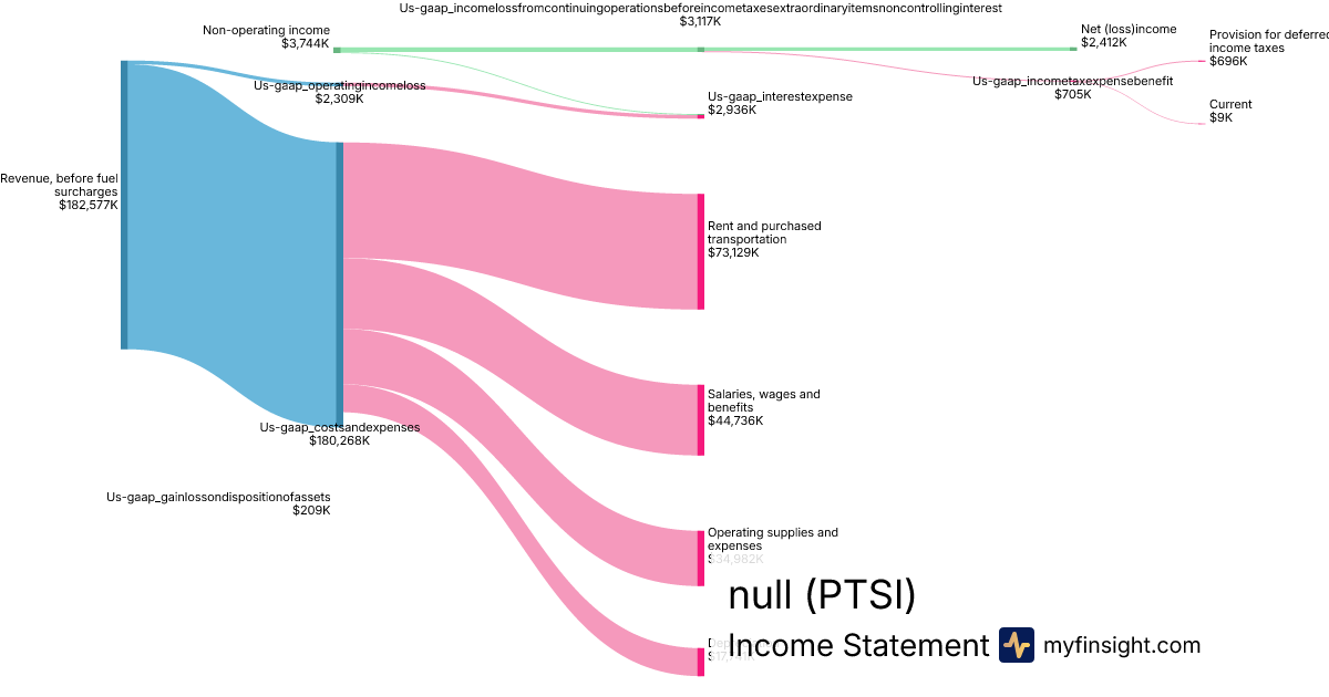 For the quarter ending 2024-09-30, PTSI made $182,577K in revenue. $2,412K in net income. Net profit margin of 1.32%.