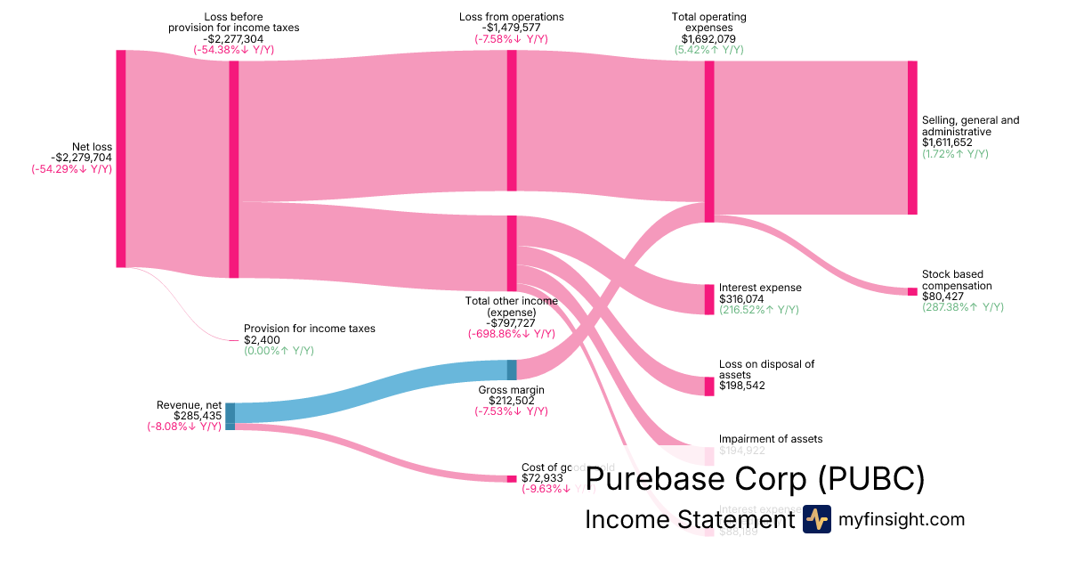 For the year ending 2025-11-30, PUBC made $285,435 in revenue. -$2,279,704 in net income. Net profit margin of -798.68%.