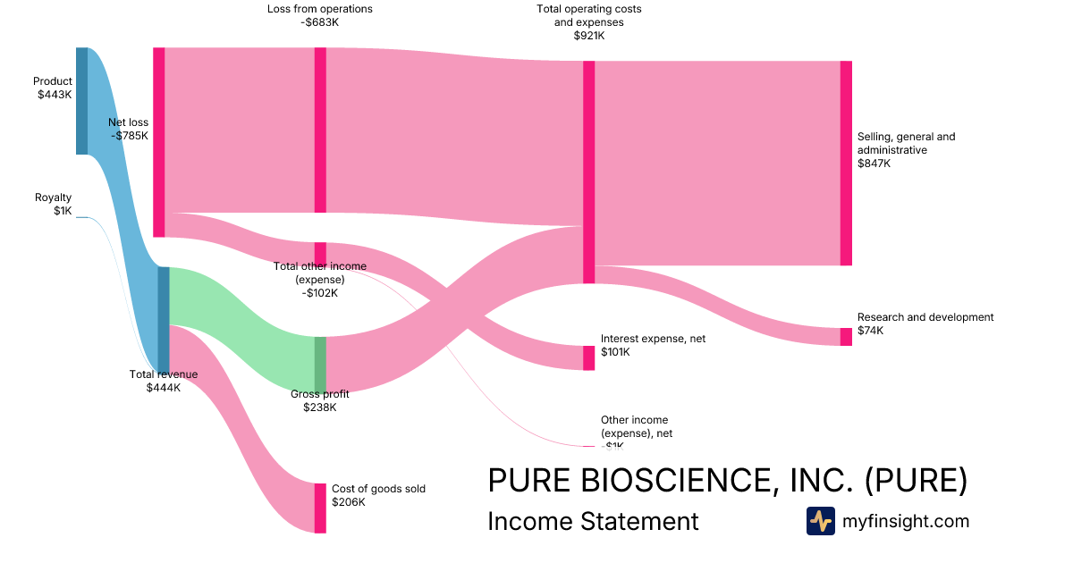 For the quarter ending 2026-01-31, PURE made $444K in revenue. -$785K in net income. Net profit margin of -176.80%.