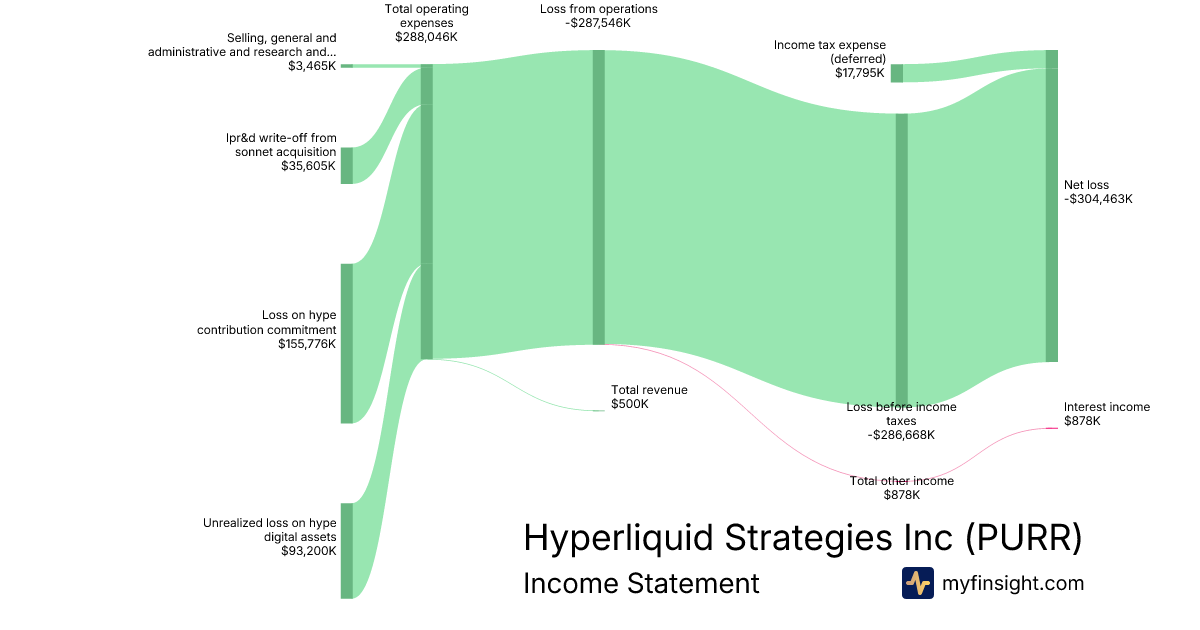 For the quarter ending 2025-12-31, PURR made $500K in revenue. -$304,463K in net income. Net profit margin of -60892.60%.