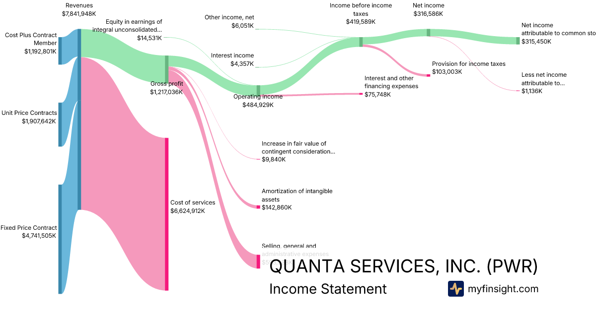 For the year ending 2025-12-31, PWR made $28,479,697K in revenue. $1,028,378K in net income. Net profit margin of 3.61%.