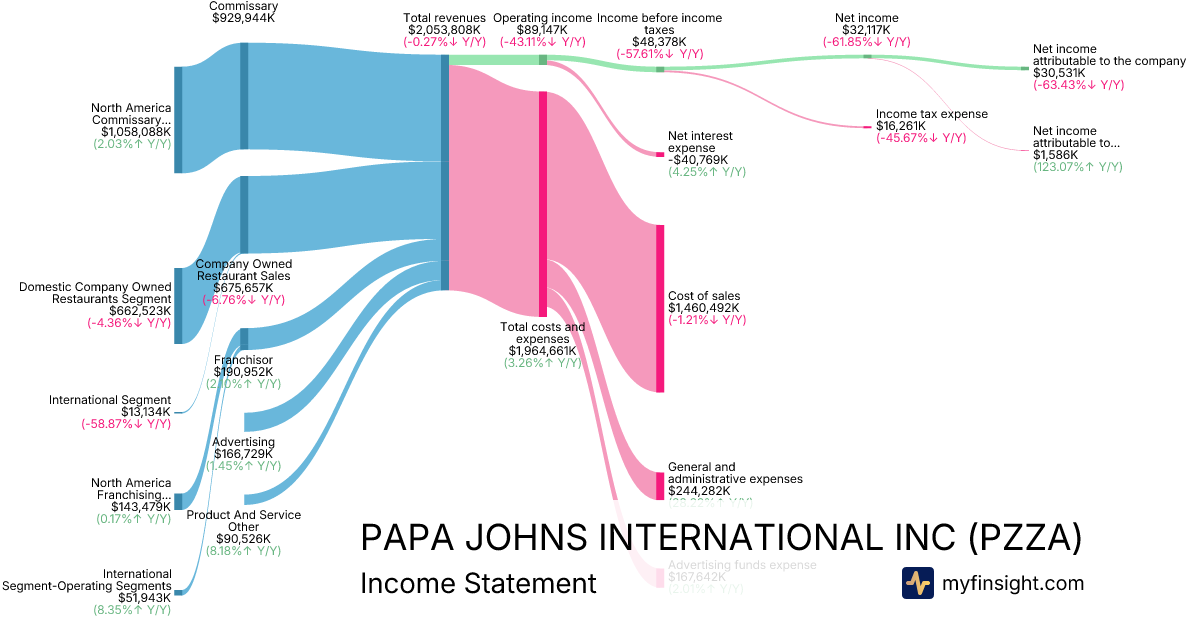 For the year ending 2025-12-28, PZZA made $2,053,808K in revenue. $30,531K in net income. Net profit margin of 1.49%.