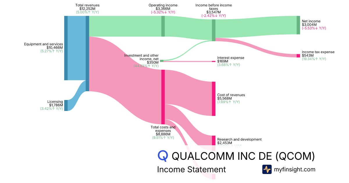 For the quarter ending 2025-12-28, QCOM made $12,252M in revenue. $3,004M in net income. Net profit margin of 24.52%.