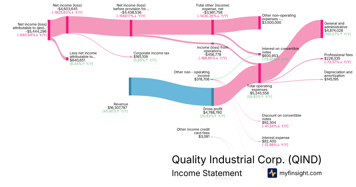 For the year ending 2025-12-31, QIND made $16,307,787 in revenue. -$5,444,296 in net income. Net profit margin of -33.38%.