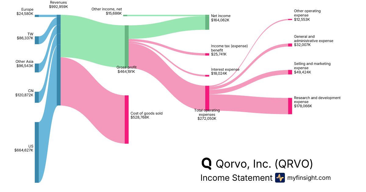 For the quarter ending 2025-12-27, QRVO made $992,959K in revenue. $164,062K in net income. Net profit margin of 16.52%.