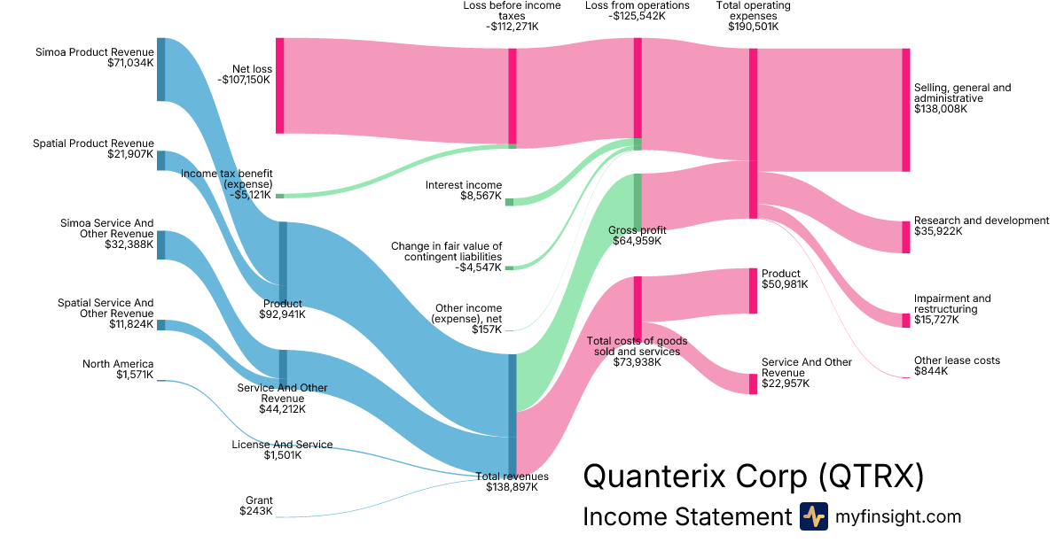 For the year ending 2025-12-31, QTRX made $138,897K in revenue. -$107,150K in net income. Net profit margin of -77.14%.