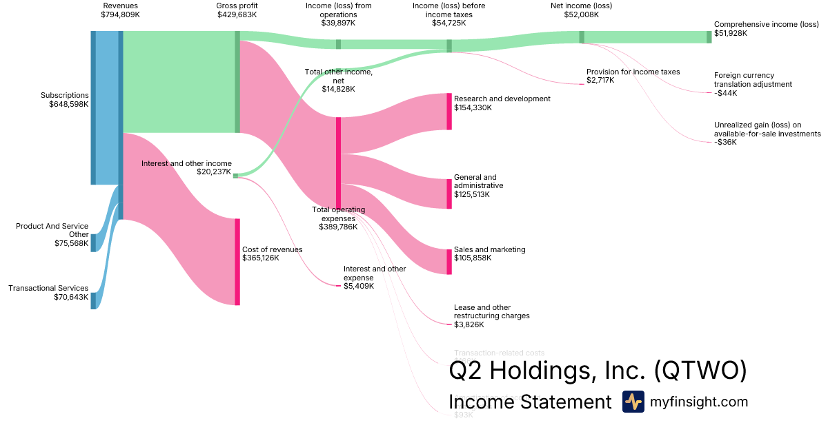 For the year ending 2025-12-31, QTWO made $794,809K in revenue. $51,928K in net income. Net profit margin of 6.53%.