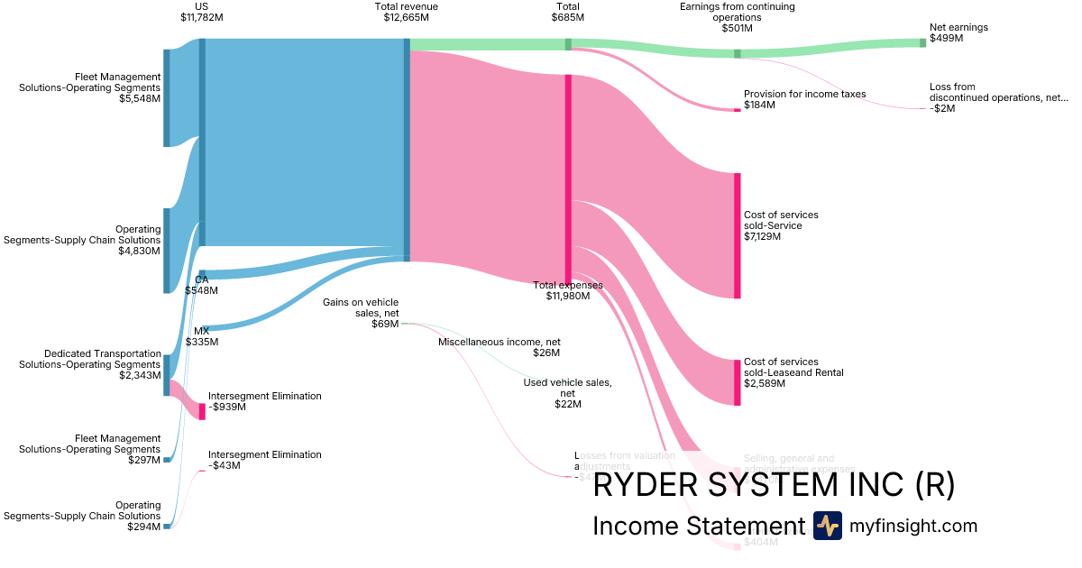 For the year ending 2025-12-31, R made $12,665M in revenue. $499M in net income. Net profit margin of 3.94%.