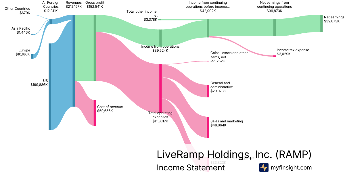 For the quarter ending 2025-12-31, RAMP made $212,197K in revenue. $39,873K in net income. Net profit margin of 18.79%.