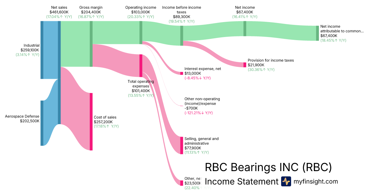 For the quarter ending 2025-12-27, RBC made $461,600K in revenue. $67,400K in net income. Net profit margin of 14.60%.