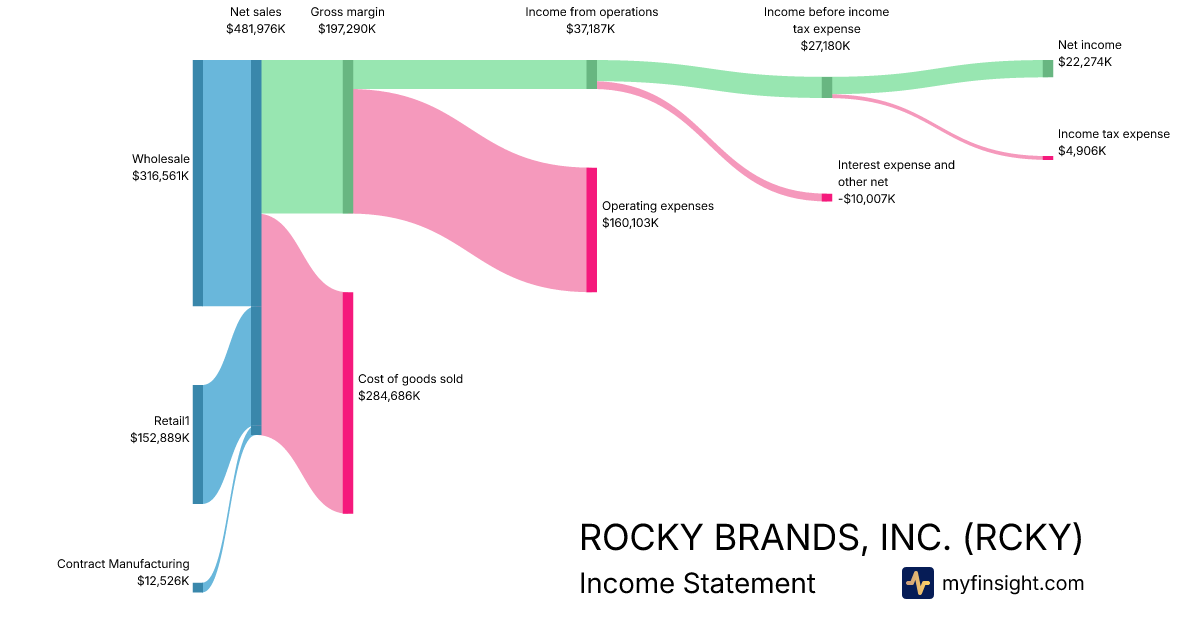 For the year ending 2025-12-31, RCKY made $481,976K in revenue. $22,274K in net income. Net profit margin of 4.62%.