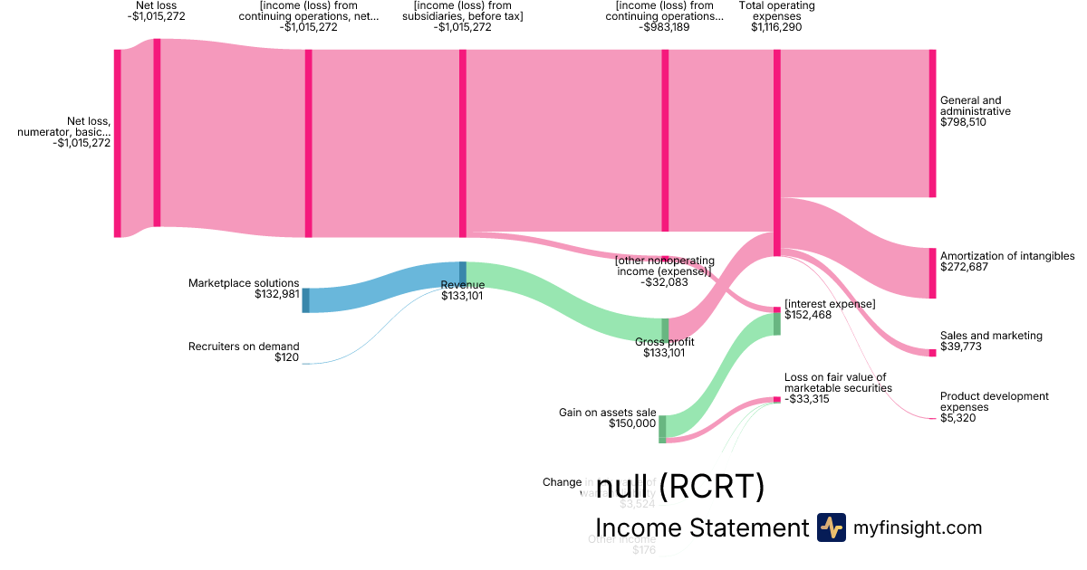 For the quarter ending 2024-06-30, RCRT made $133,101 in revenue. -$1,015,272 in net income. Net profit margin of -762.78%.