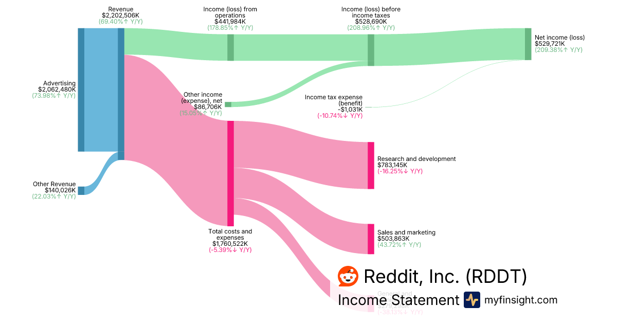 For the year ending 2025-12-31, RDDT made $2,202,506K in revenue. $529,721K in net income. Net profit margin of 24.05%.
