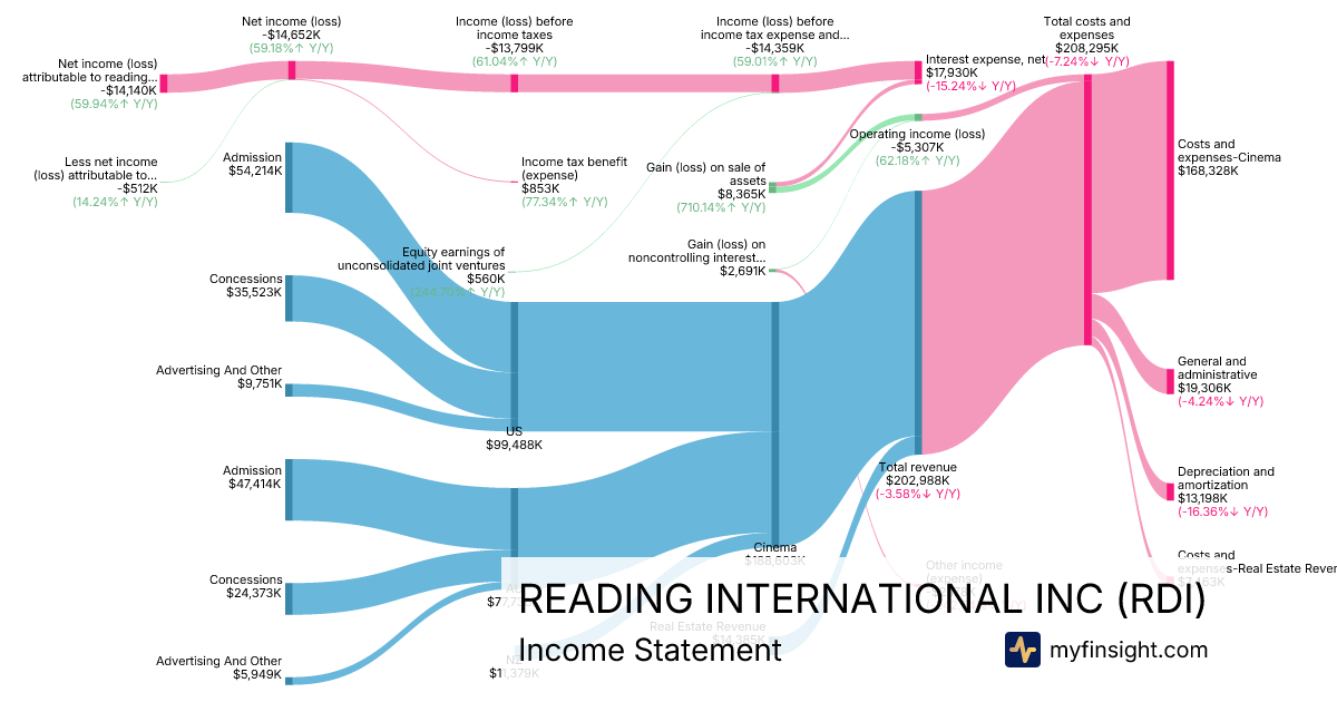 For the year ending 2025-12-31, RDI made $202,988K in revenue. -$14,140K in net income. Net profit margin of -6.97%.