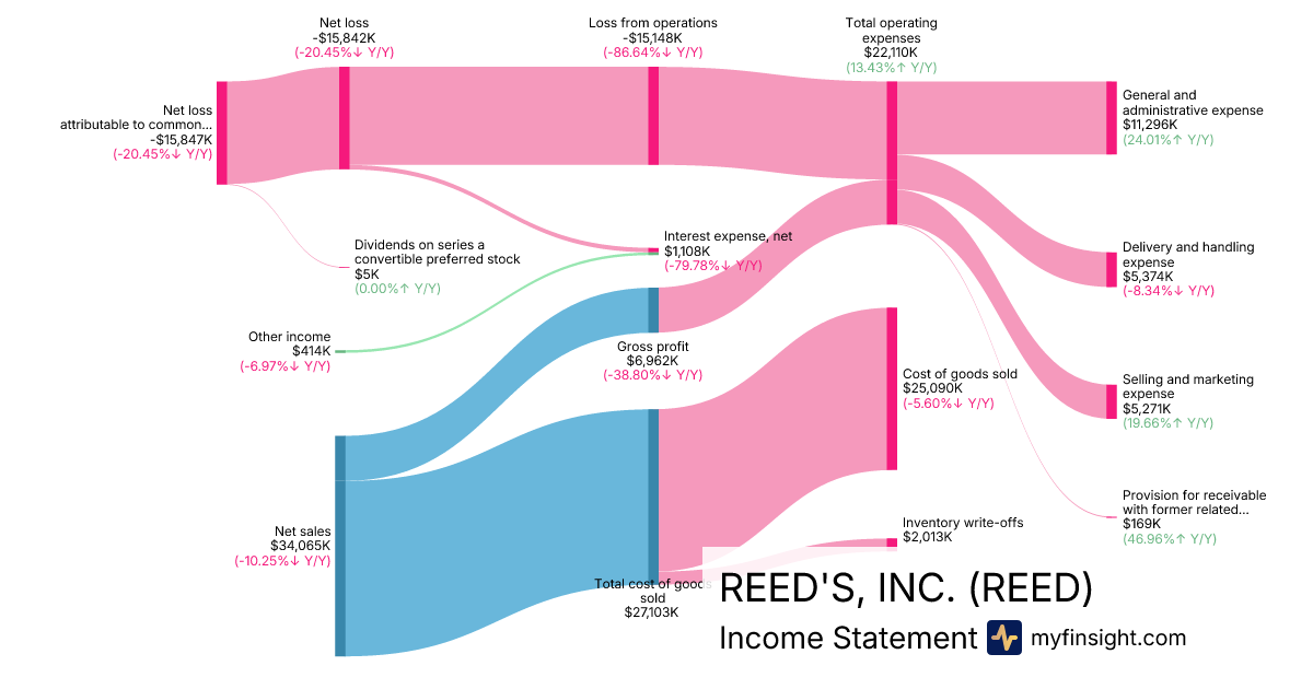 For the year ending 2025-12-31, REED made $34,065K in revenue. -$15,847K in net income. Net profit margin of -46.52%.