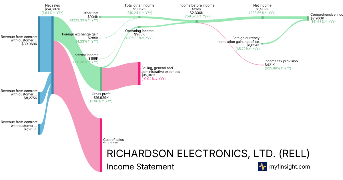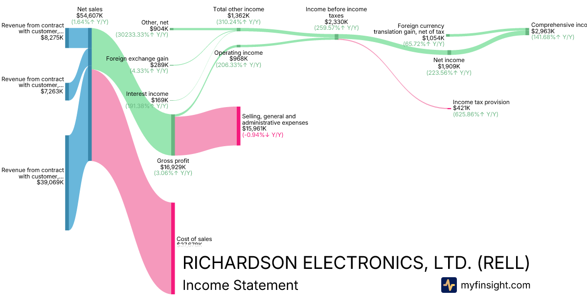 For the quarter ending 2025-08-30, RELL made $54,607K in revenue. $2,963K in net income. Net profit margin of 5.43%.