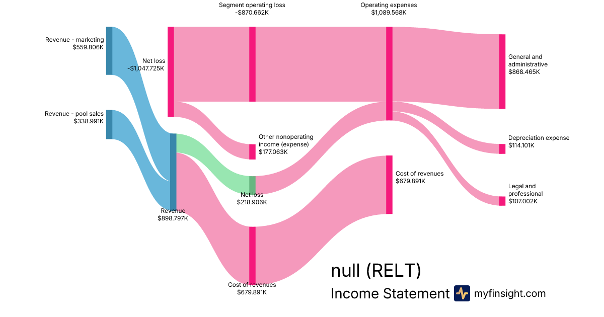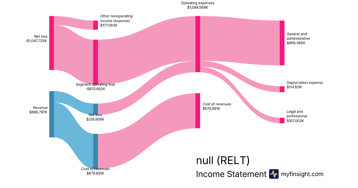 For the quarter ending 2024-09-30, RELT made $898.797K in revenue. -$1,047.725K in net income. Net profit margin of -116.57%.