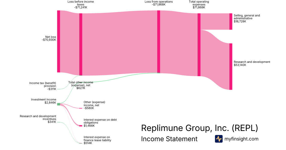 For the quarter ending 2025-12-31, REPL made $74,744K in revenue. -$70,930K in net income. Net profit margin of -94.90%.
