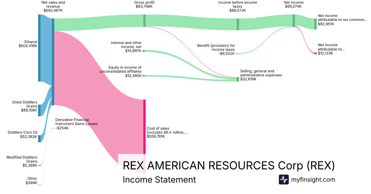 For the year ending 2026-01-31, REX made $650,487K in revenue. $82,951K in net income. Net profit margin of 12.75%.