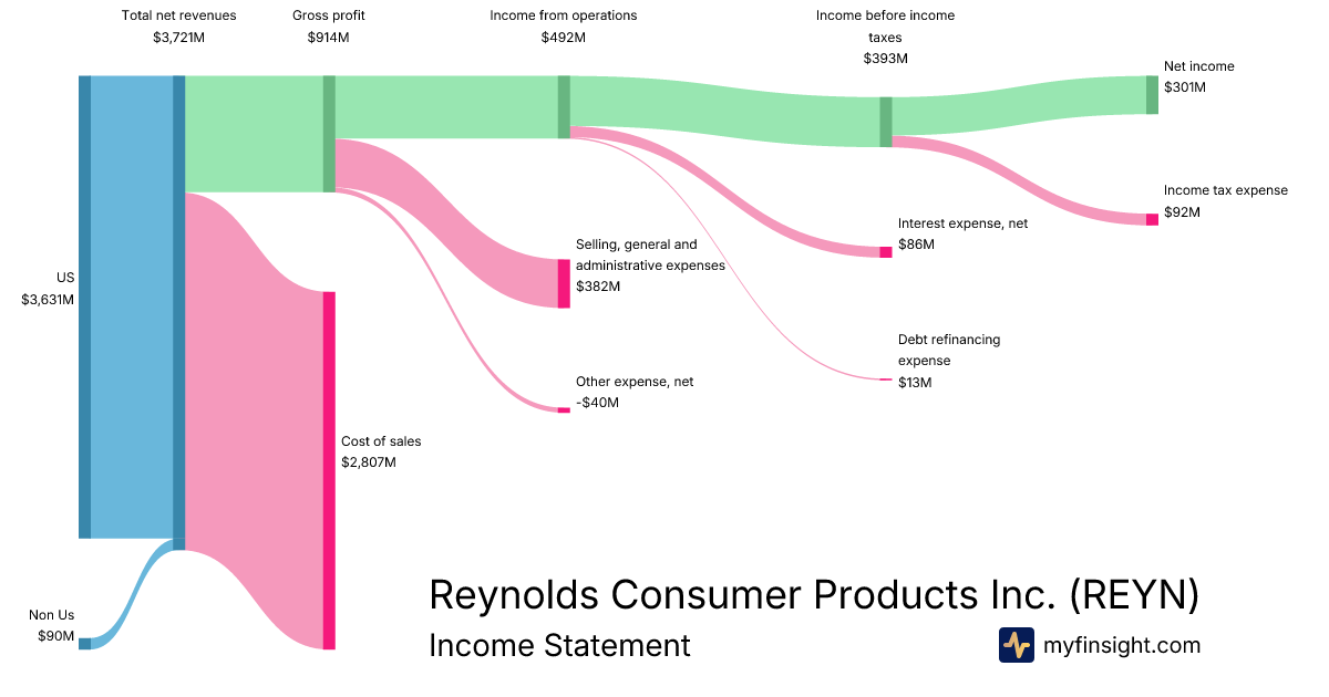For the year ending 2025-12-31, REYN made $3,721M in revenue. $301M in net income. Net profit margin of 8.09%.