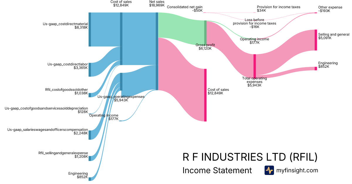 For the quarter ending 2026-01-31, RFIL made $18,969K in revenue. -$50K in net income. Net profit margin of -0.26%.