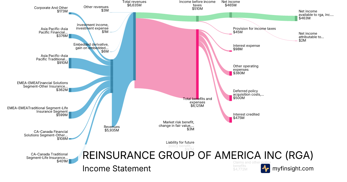 For the year ending 2025-12-31, RGA made $23,698M in revenue. $1,182M in net income. Net profit margin of 4.99%.