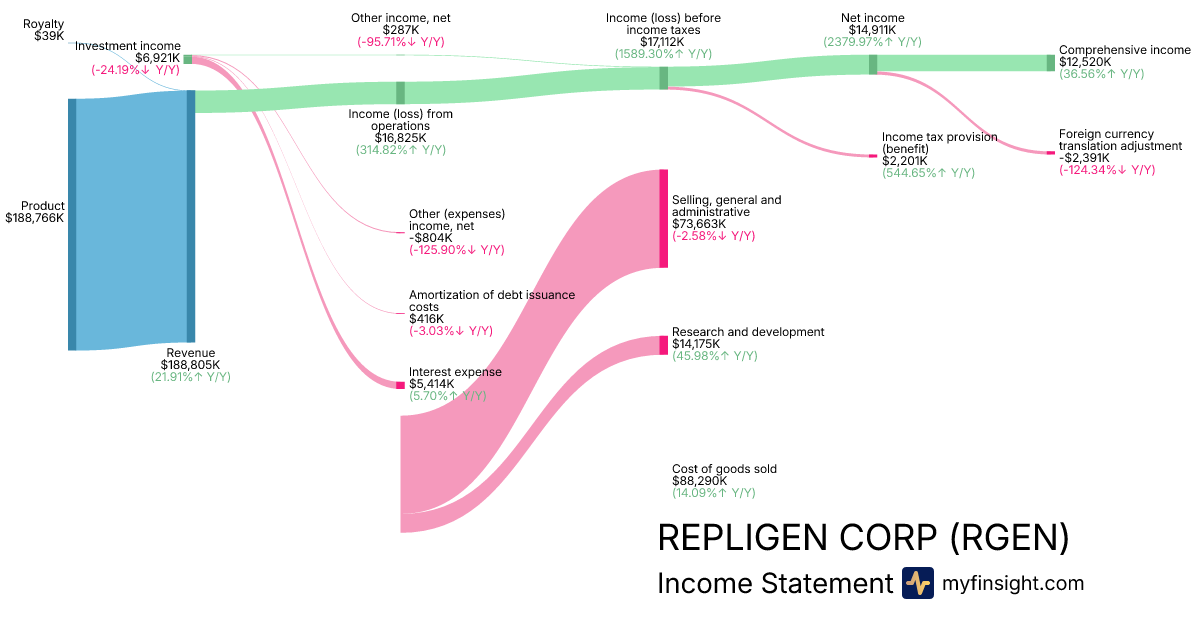 For the quarter ending 2025-09-30, RGEN made $188,805K in revenue. $12,520K in net income. Net profit margin of 6.63%.