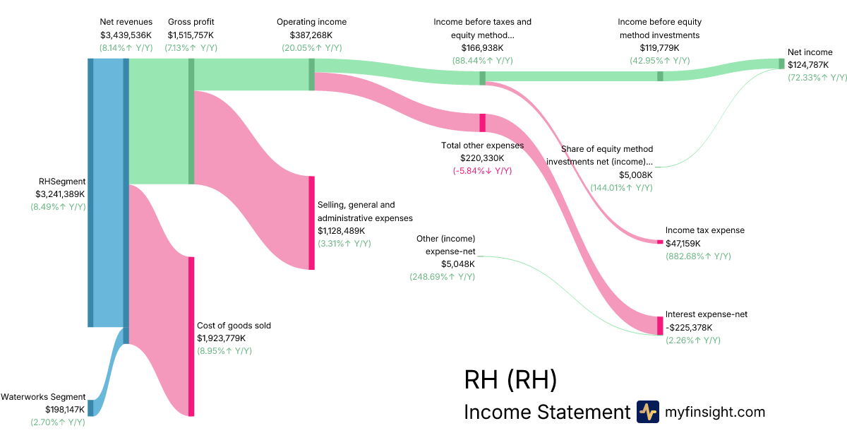 For the year ending 2026-01-31, RH made $3,439,536K in revenue. $124,787K in net income. Net profit margin of 3.63%.